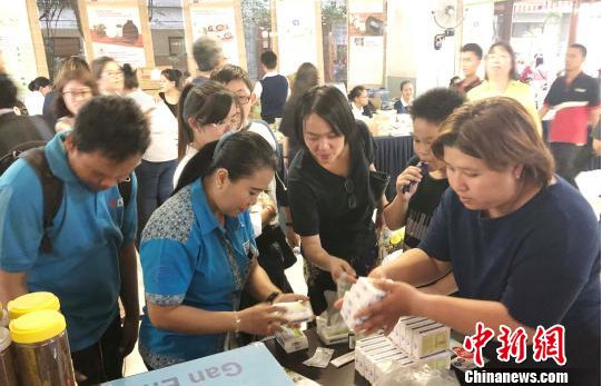 ▲圖為由中國知名中成藥企業(yè)主辦的一場(chǎng)活動(dòng)中,印尼民眾爭(zhēng)相購買太極藿香正汽口服液。鐘欣 攝