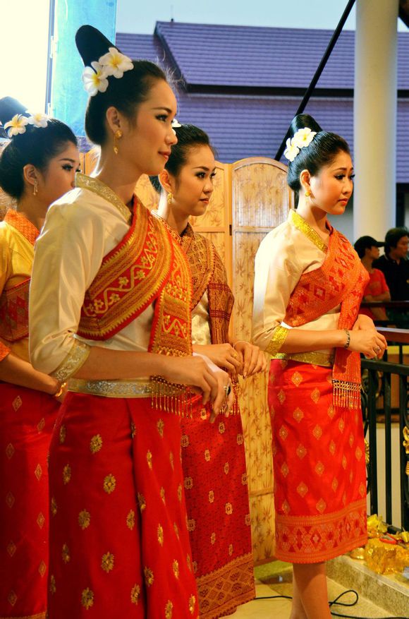 老撾女士一般都有多套正裝行頭,面料看起來明顯出自于手工紡織。女士的正裝色彩斑斕,配上做工考究的民俗圖案和珠璉佩飾,給人一種質(zhì)樸、莊重的感覺。年輕女士的正裝顏色豐富,以鵝黃、桔橙、粉色、淡紫為主要色彩;中老年女士的正裝則青睞深紫、咖啡、墨綠、深藍等顏色。老撾人在集會時,一定會正裝出席,一改平日休閑、隨意的裝束。