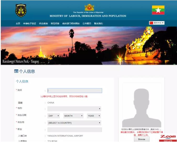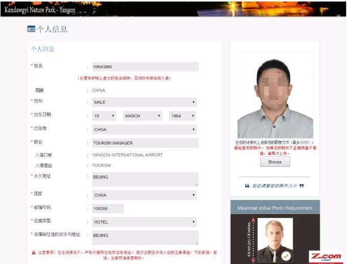 這是頁(yè)面的上半部分;比較簡(jiǎn)單;名字;國(guó)籍;性別,出生日期;出生地,職業(yè),這些都按照護(hù)照的信息填寫;常駐家庭地址;國(guó)家;郵編;在緬甸的入住酒店的類型;酒店,公寓,快捷酒店;之類的選擇;酒店的名稱;還沒有預(yù)定的話,就可以上網(wǎng)預(yù)定一個(gè)可以取消的那種;很多網(wǎng)站都可以在一定時(shí)間內(nèi)取消酒店;預(yù)定一個(gè),這些酒店信息就都有了;注意,照片不能大于2M哦;