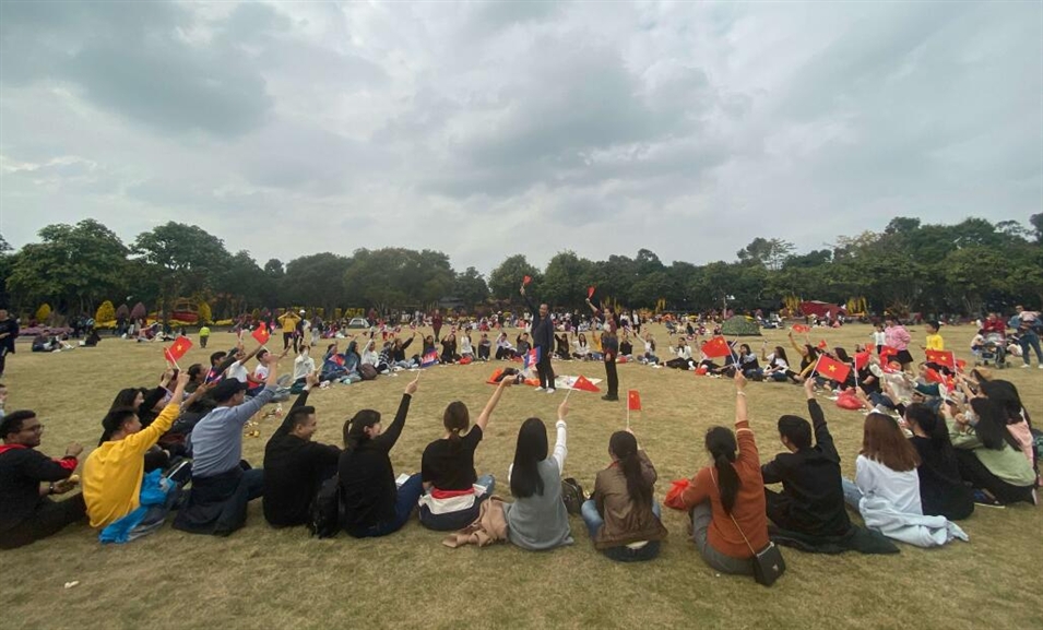 圖為東盟留學(xué)生于青秀山大草坪進行游戲互動