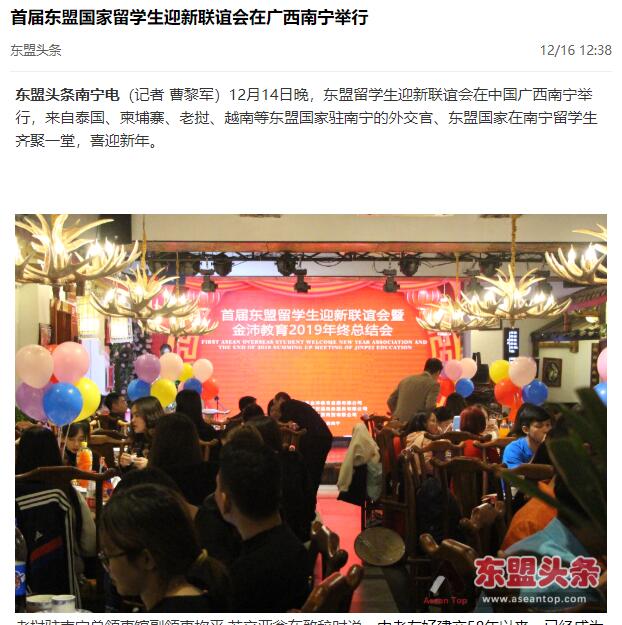 此次“首屆東盟留學(xué)生迎新聯(lián)誼會”得到東盟相關(guān)主流媒體的關(guān)注和報道,引起了東盟留學(xué)生的熱烈反響,這將為我們進一步開展中國-東盟國際教育合作發(fā)展提供強有力的媒體支持。