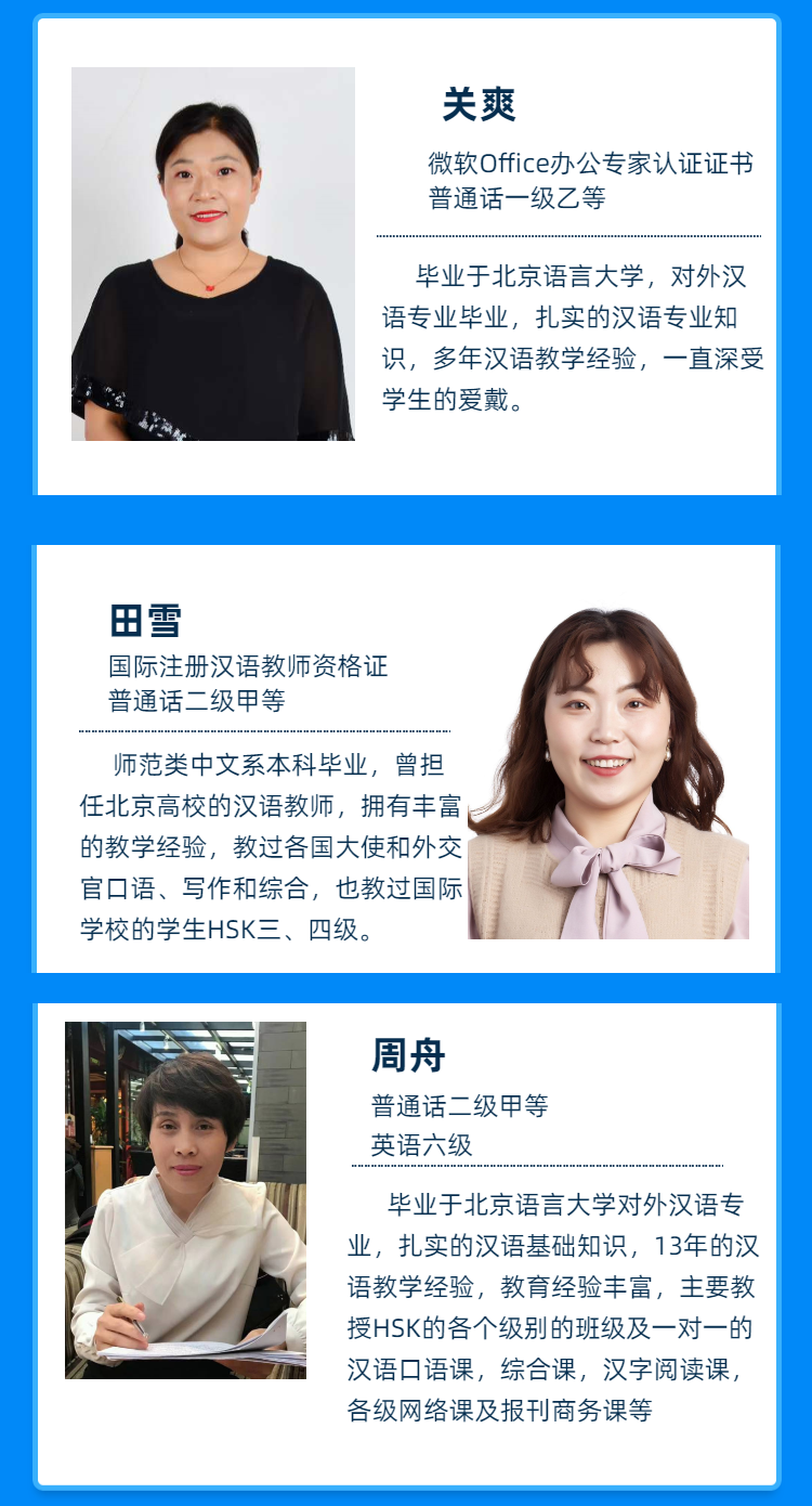 金沛漢語(yǔ)學(xué)院擁有雄厚師資力量和優(yōu)秀的教師團(tuán)隊(duì),中國(guó)名校名師在線課堂,扎實(shí)的專業(yè)知識(shí)、漢語(yǔ)考試技巧、方向,根據(jù)學(xué)生目標(biāo),制定適合的教學(xué)計(jì)劃,助你順利過(guò)關(guān)!