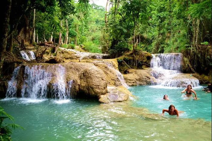 這里是一座寬廣的多層瀑布,瀑布總高100米,瀑布從石灰石山峰傾瀉而下,注入下面一系列清涼、翠綠色的水潭中。三層瀑布傾瀉而下,形成多個泛著藍(lán)綠色光澤的水潭,這里的景色像極了九寨溝的五彩池。陽光透過樹葉的間隙灑在涓涓溪流中,溪面就好像是一片片破碎的鏡子,點點地閃爍魚鱗般的光,如夢似幻,讓人迷醉。在這里最熱門的活動莫過于大樹繩索跳水,在水潭內(nèi)嬉戲不要著急上岸,可以安靜的在水里享受一下純天然免費小魚SPA。