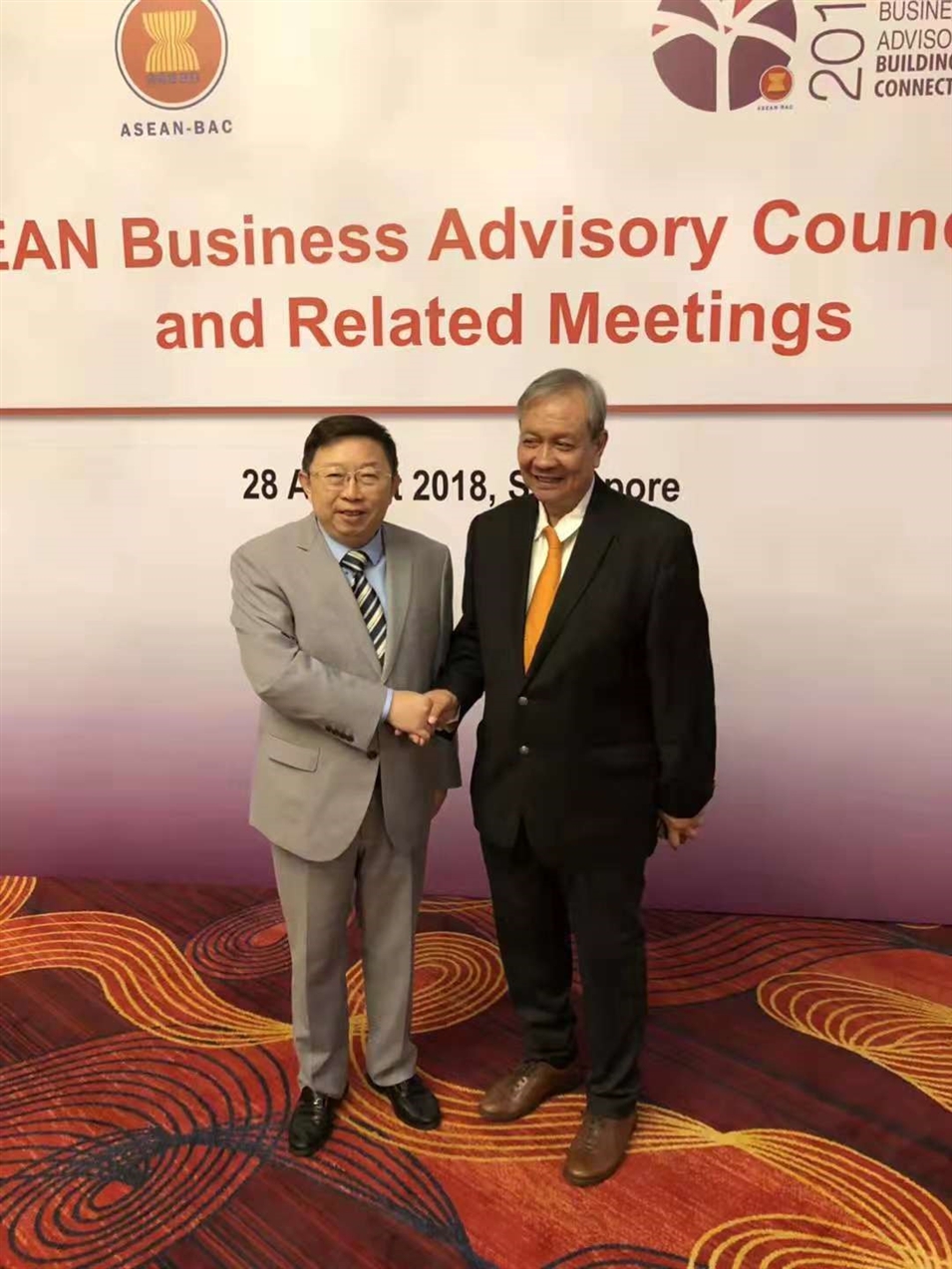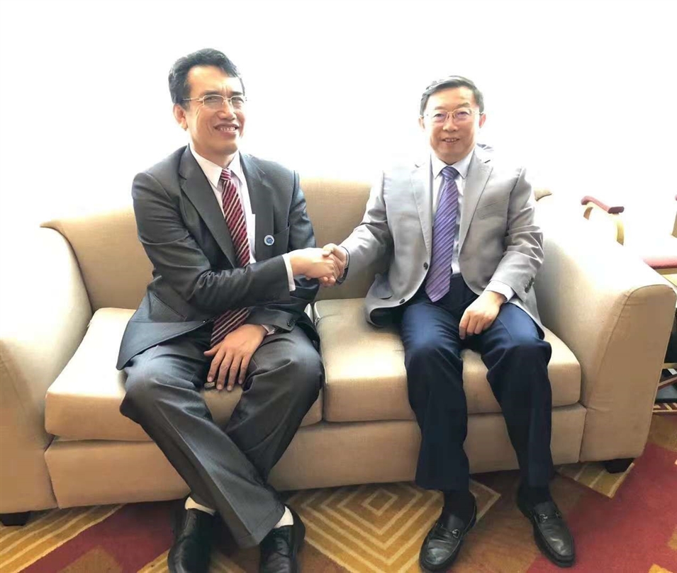 2018年9月,中國—東盟商務(wù)理事會(huì)執(zhí)行理事長許寧寧與老撾科技部副部長交談。
