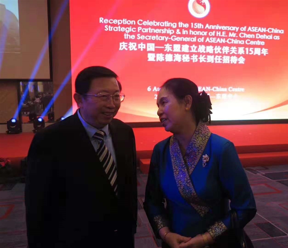 2018年8月,在中國—東盟建立戰(zhàn)略伙伴關(guān)系15周年招待會(huì)上,許寧寧與老撾駐華大使交談。