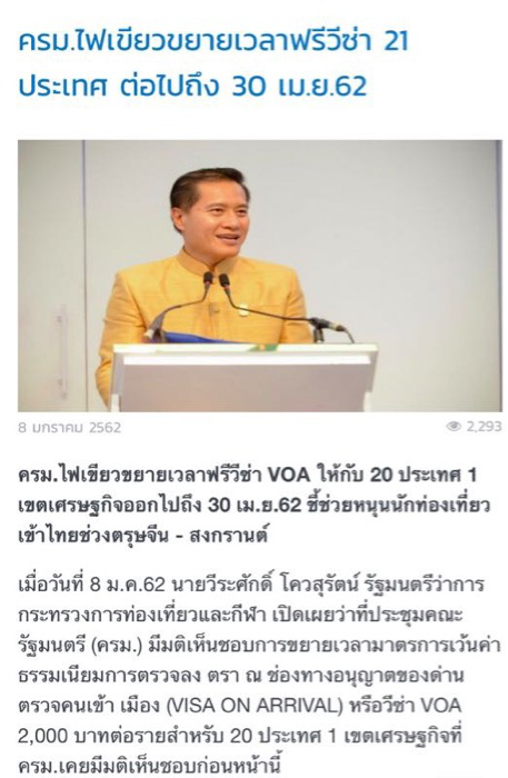 泰國(guó)對(duì)21個(gè)國(guó)家和地區(qū)的落地簽免費(fèi)政策延長(zhǎng)至4月30日。圖片來(lái)源/泰國(guó)媒體Bangkokbiznews《曼谷商業(yè)新聞》截圖