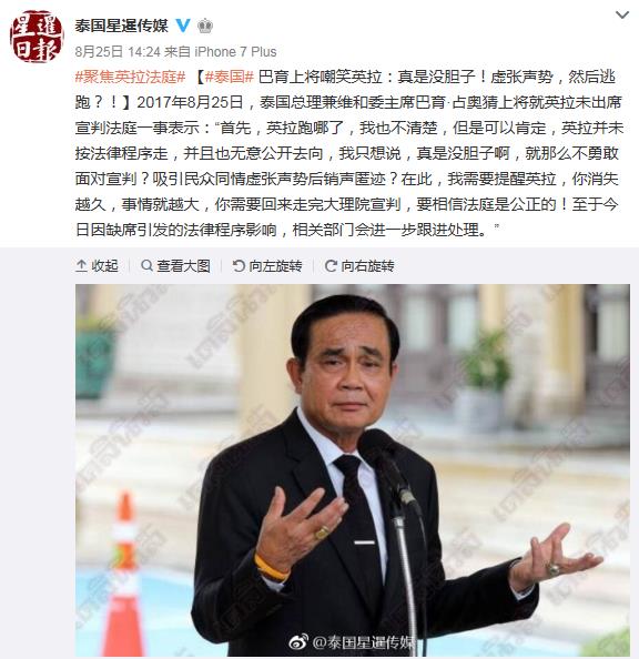 【環(huán)球網(wǎng)綜合報(bào)道】泰國(guó)前總理英拉卷入大米收購瀆職案,原定周五(25日)在最高法院判刑,但英拉當(dāng)日未有出庭,去向成謎。法新社26日引述泰國(guó)軍政府人士的消息稱,英拉現(xiàn)時(shí)身處阿聯(lián)酋迪拜,很有可能前往英國(guó)尋求政治庇護(hù)。