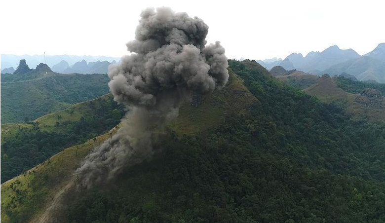掃雷隊(duì)在中越邊境廣西段某雷場(chǎng)引爆炸藥,以清除雷場(chǎng)植被,方便后期搜排